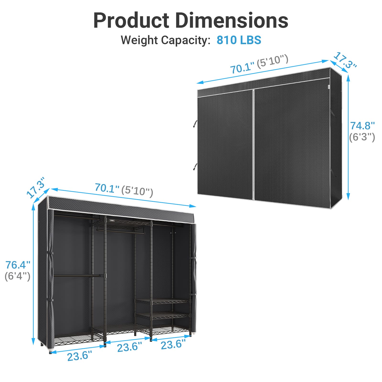 - Dimensions & Load Capacity: 70.1" L x 17.3" W x 76.4" H (includes cover). Load capacity up to 890 lbs. Single hanging rod can support up to 60 lbs, Wire shelf can support up to 88 lbs for each.