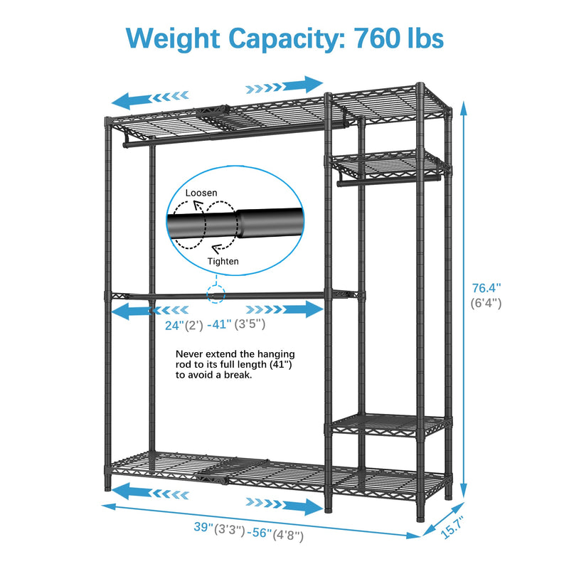 - Dimensions & Load Capacity: 39"-56"W x 15.8"D x 76.4"H, X20 clothing rack maximum load capacity 760 lbs., Constructed of high-quality carbon steel, sturdy and reliable, it is long-lasting and features anti-tip devices to prevent unexpected falling
